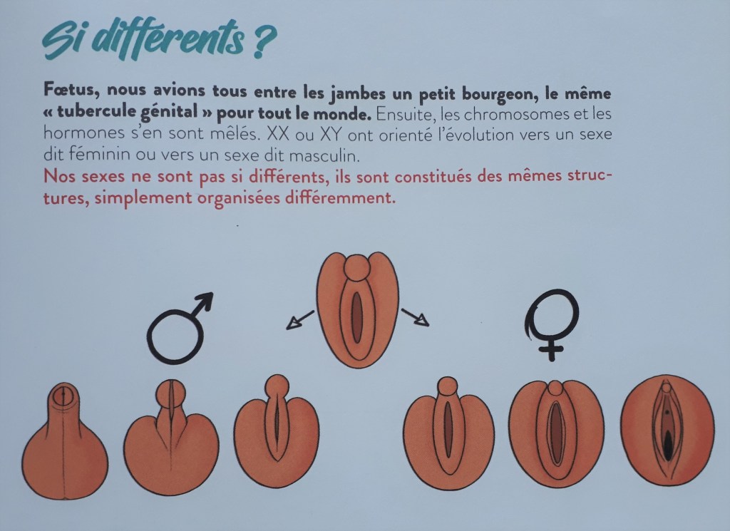 Lors des premières semaines de développement du foetus, le « tubercule génital » est le même, quel que soit le futur sexe biologique. Il en va de même pour les ovaires et les testicules qui sont à l’origine des gonades indifférenciées. Ce sont les chromosomes XX ou XY (ou XXY, XXX, XYY, etc.) et les hormones qui vont orienter l’évolution des parties génitales vers des organes mâles ou femelle, et ce après plusieurs semaines de gestation.