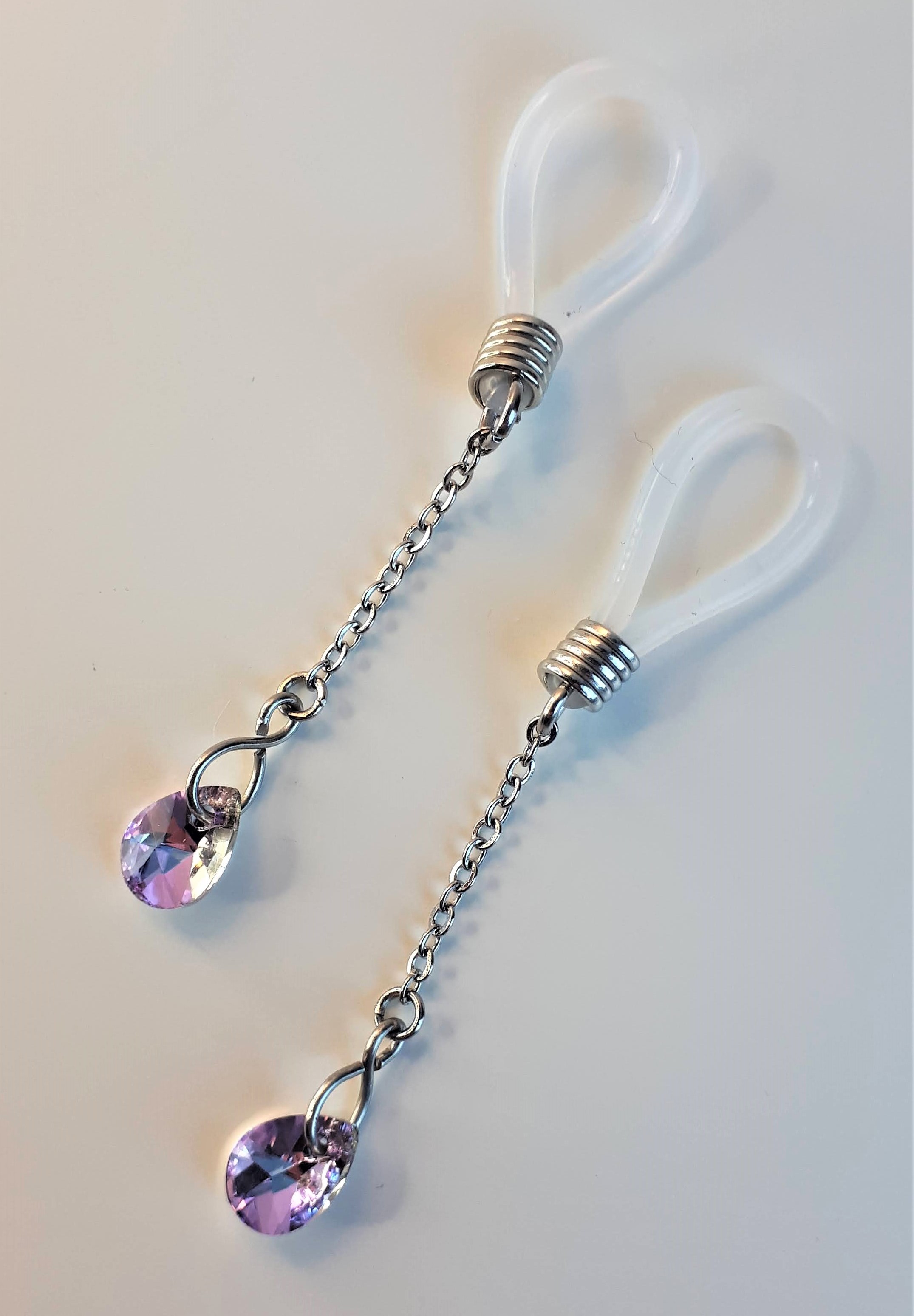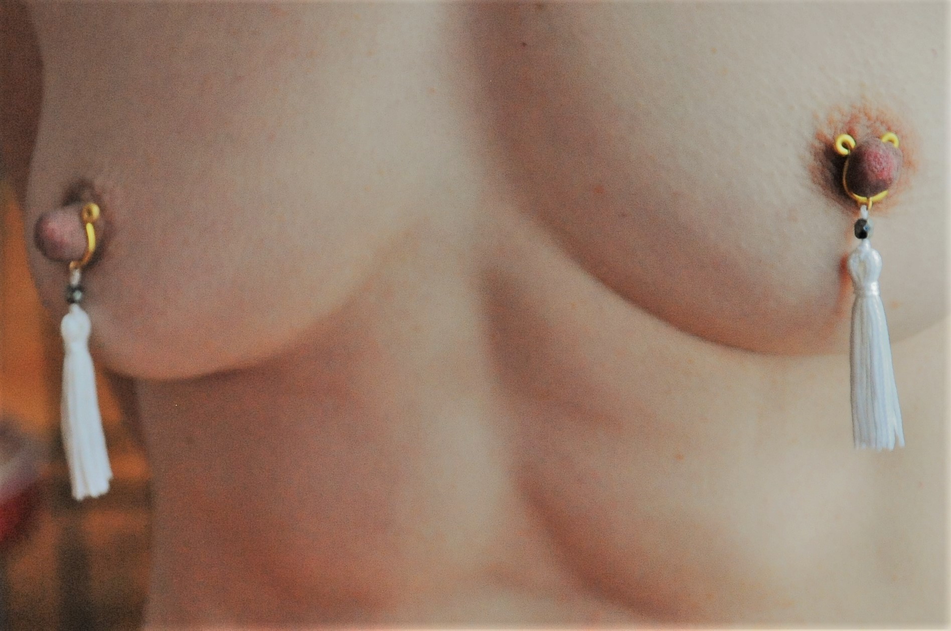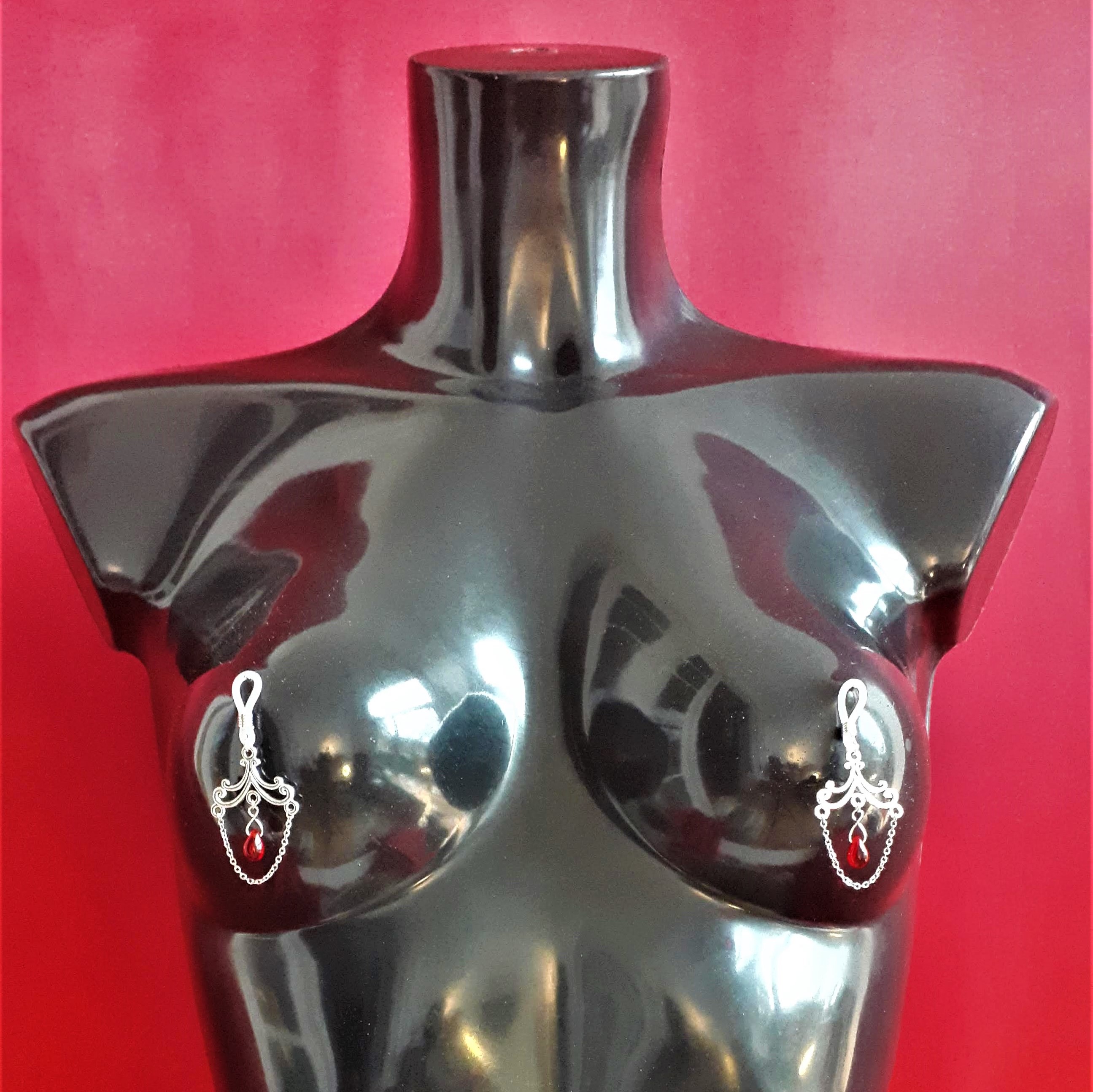 Les boucles de seins s’attachent aux tétons pour mettre en valeur la gorge et les seins. Elles sont agrémentées de pièces d’alliage argenté ou doré, de gouttes, de perles ou d’étoiles et ne contiennent ni nickel, ni plomb, ni cadmium. Toutes les boucles peuvent se placer sur un piercing de téton.