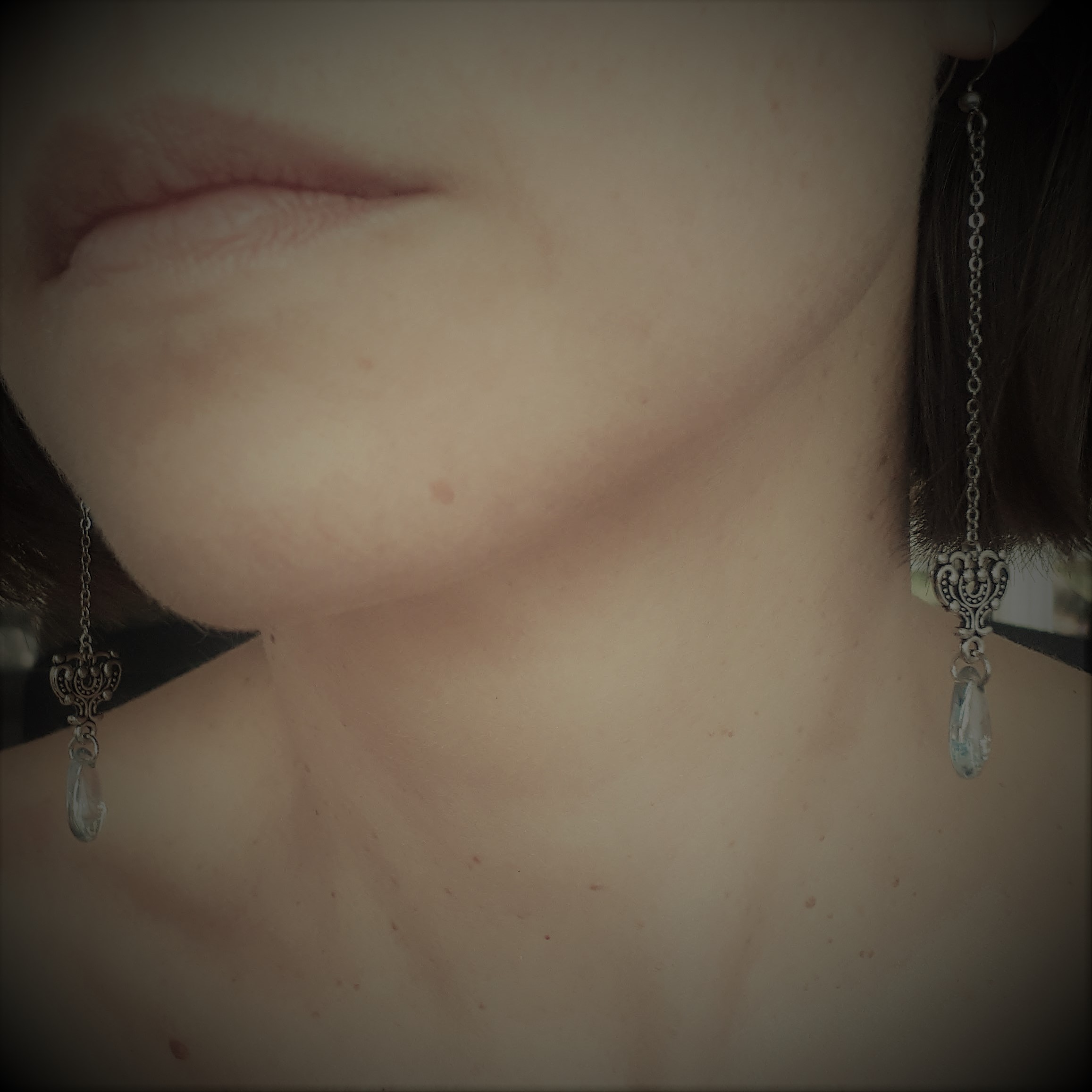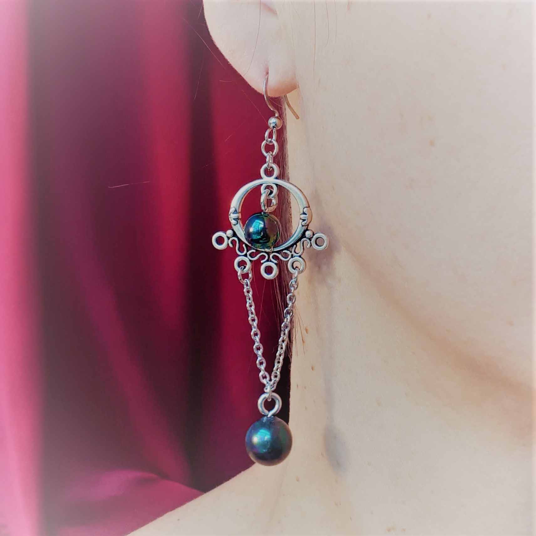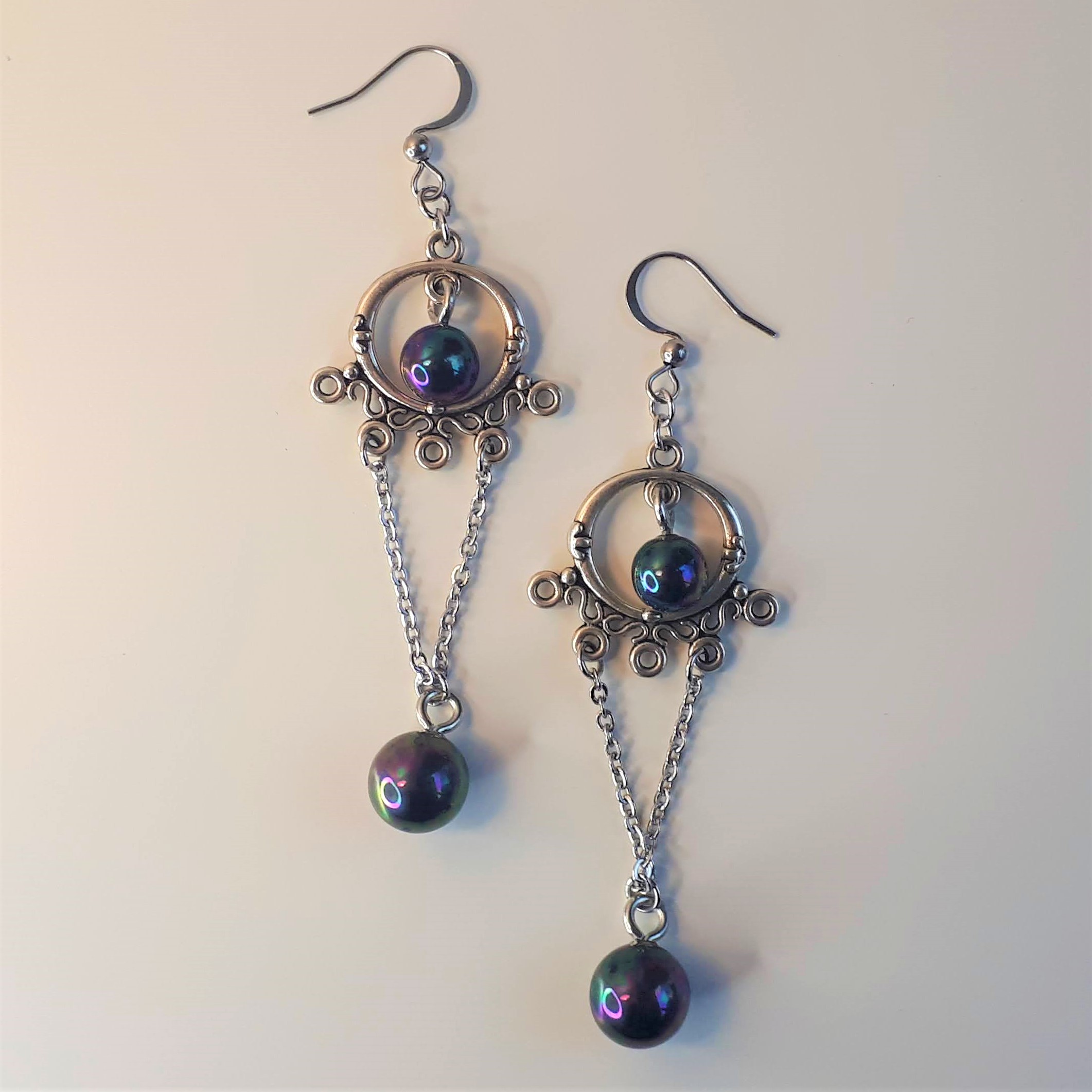 Alliage argenté, chaîne en acier inoxydable, perles en verre irrisé Attaches d’oreille en acier inoxydable