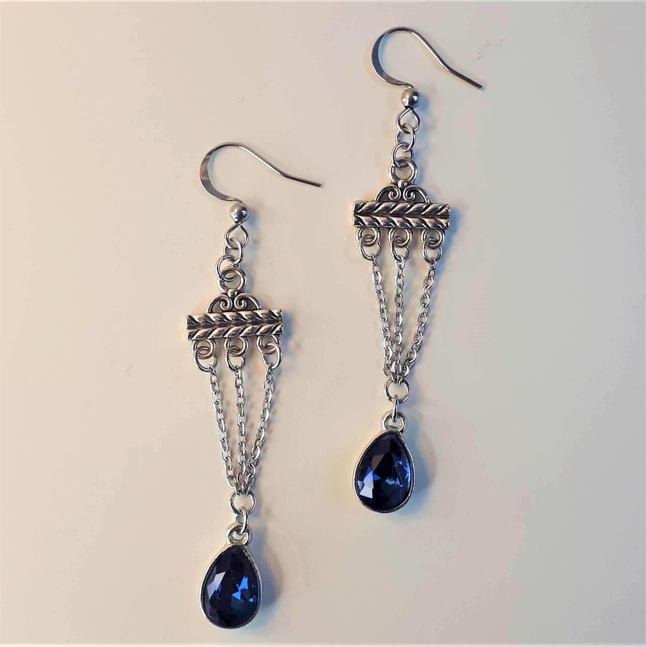 Alliage argenté, chaîne en acier inoxydable, gouttes bleu saphir Attaches d’oreille en acier inoxydable
