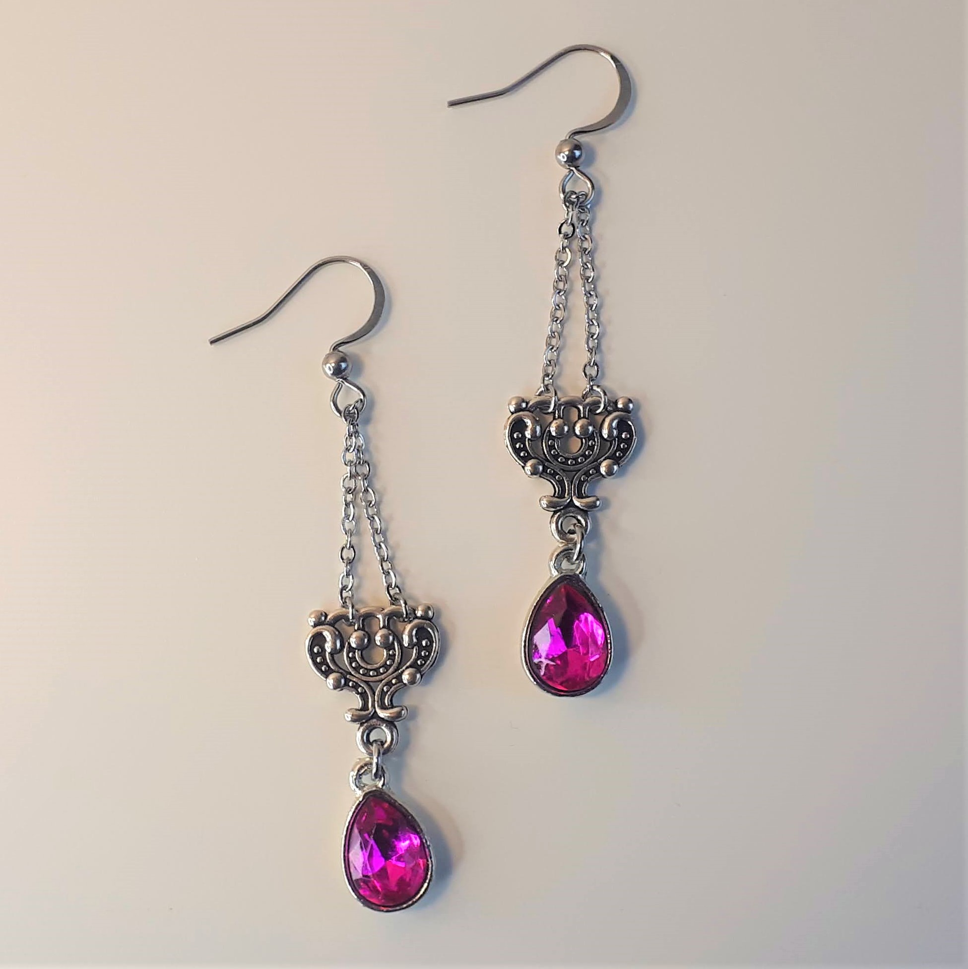 Alliage argenté, chaîne en acier inoxydable et goutte fuchsia Attaches d’oreille en acier inoxydable