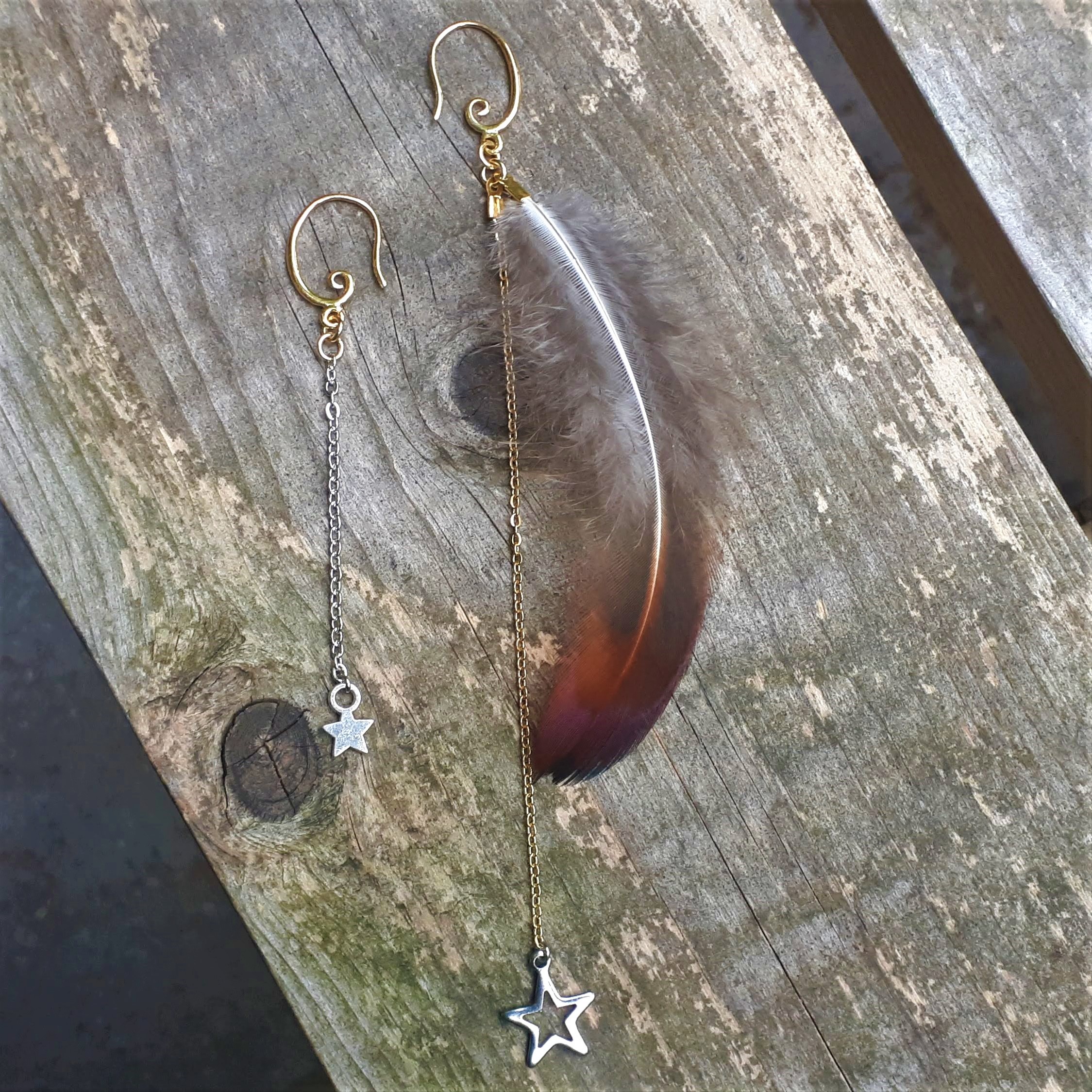 Chaîne et étoiles en acier inoxydable naturel et doré, plume Attaches d’oreille en alliage doré Dépareillées