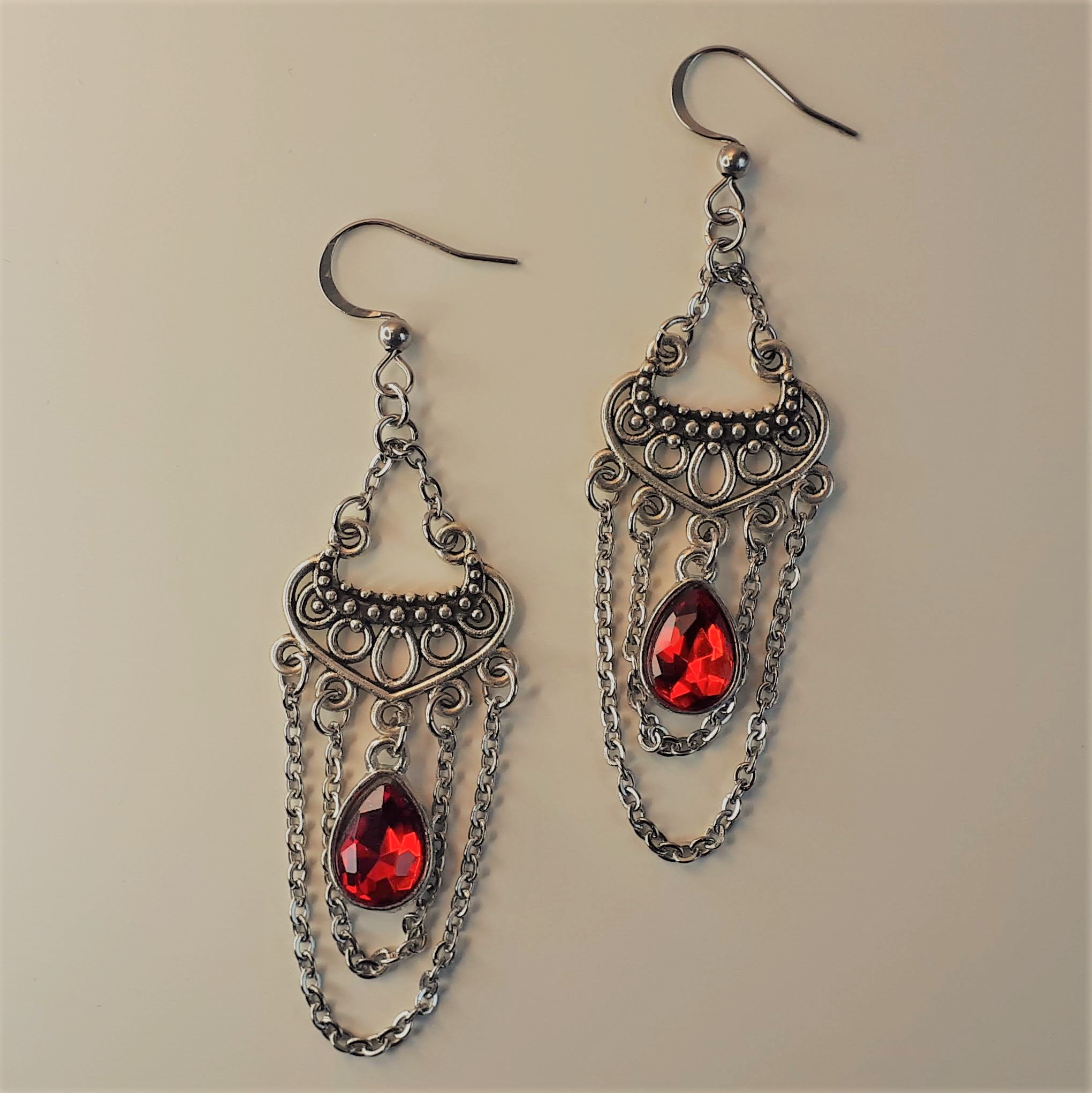 Alliage argenté, chaîne en acier inoxydable et goutte rouge Attaches d’oreille en acier inoxydable
