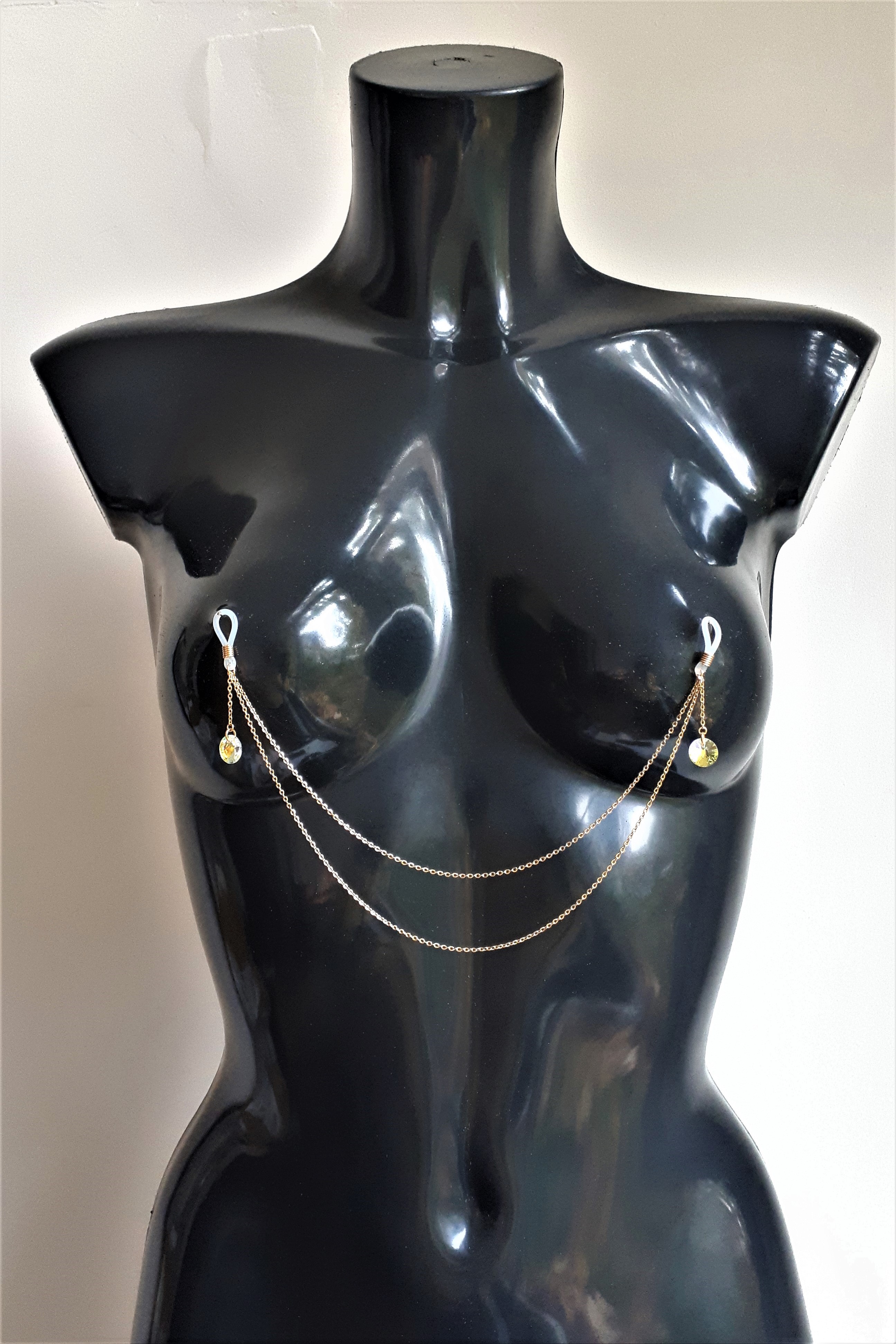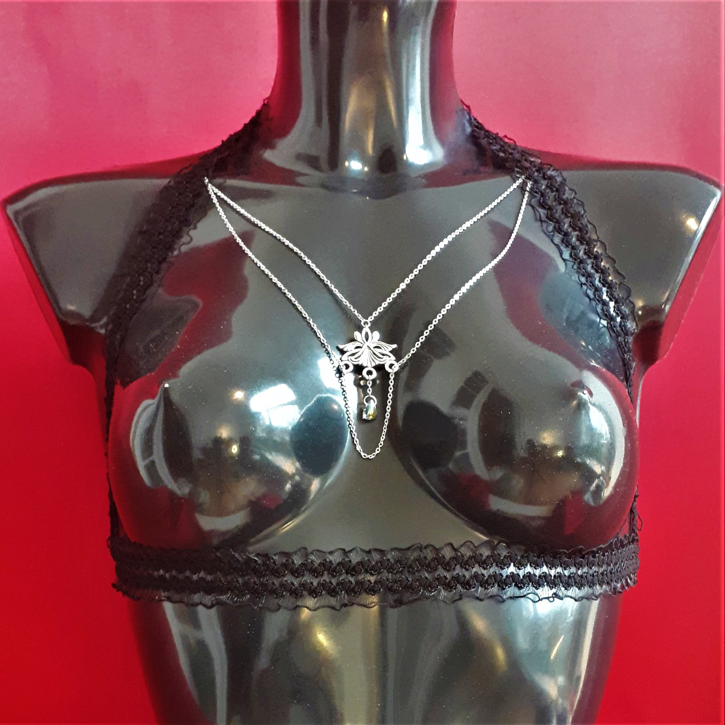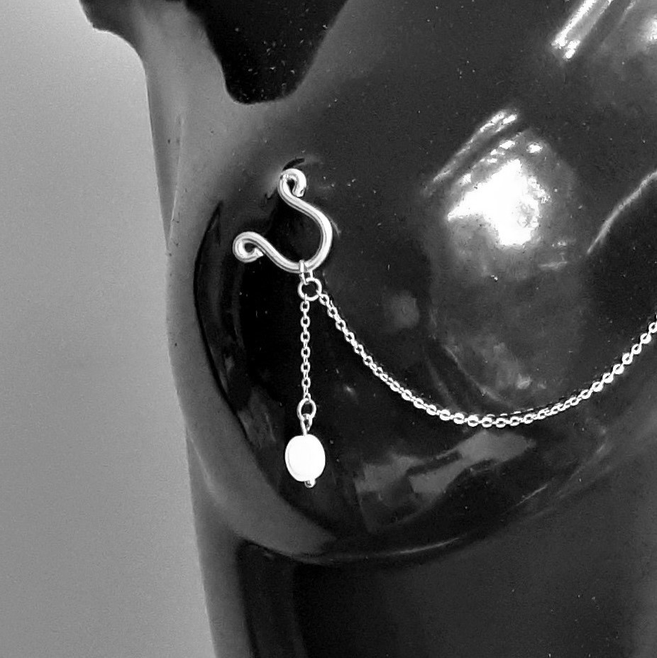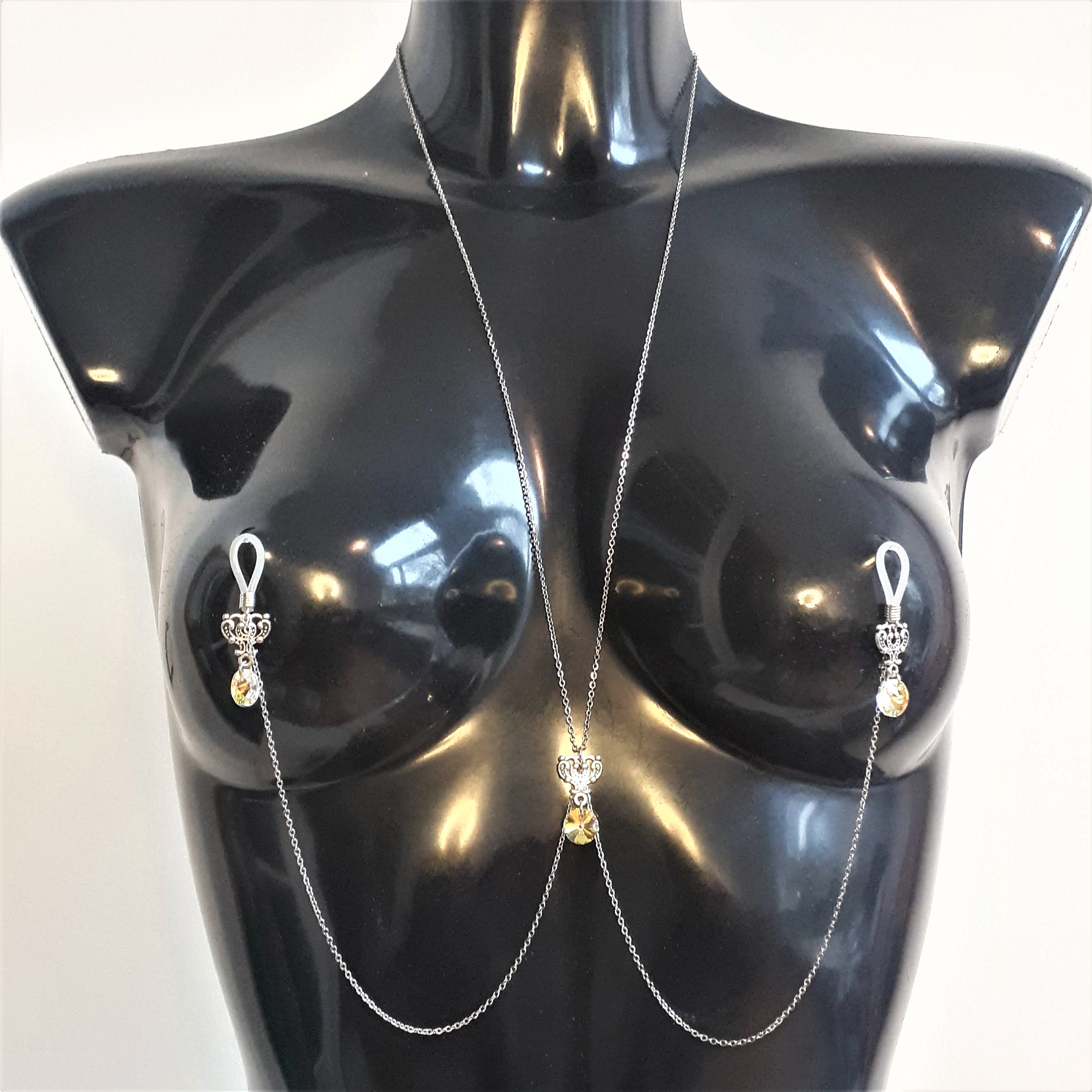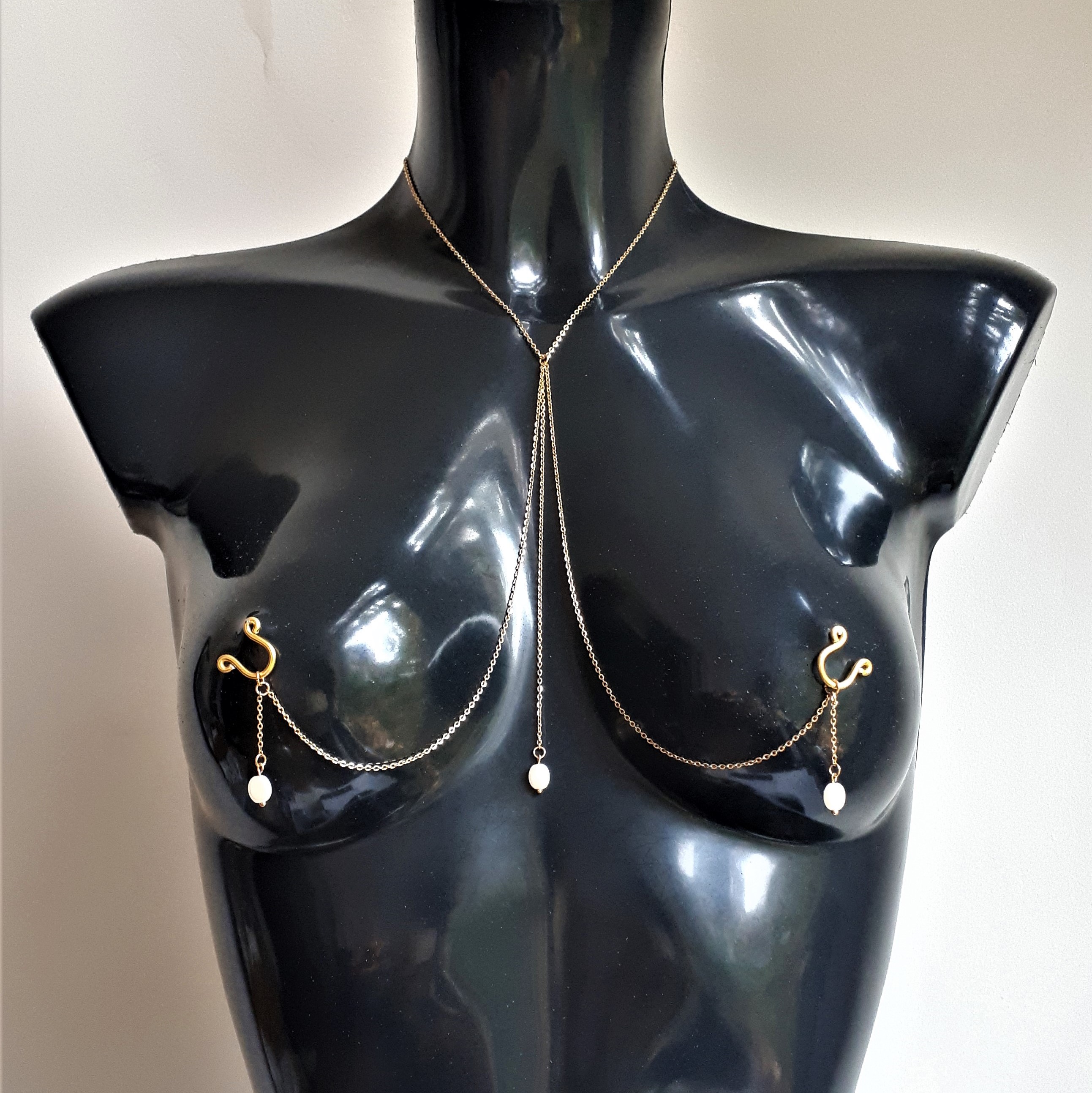 L es colliers de seins et de buste partent du cou pour s’attacher aux seins-mêmes ou les encadrer. Ils sont agrémentés de pièces d’alliage argenté ou doré, de gouttes, de perles ou d’étoiles et ne contiennent ni nickel, ni plomb, ni cadmium. Je propose deux types d’attaches réglables (non douloureuses !) au choix : des attaches en aluminium pour les personnes dont les tétons sont plus larges, ou en silicone pour les tétons plus petits.
