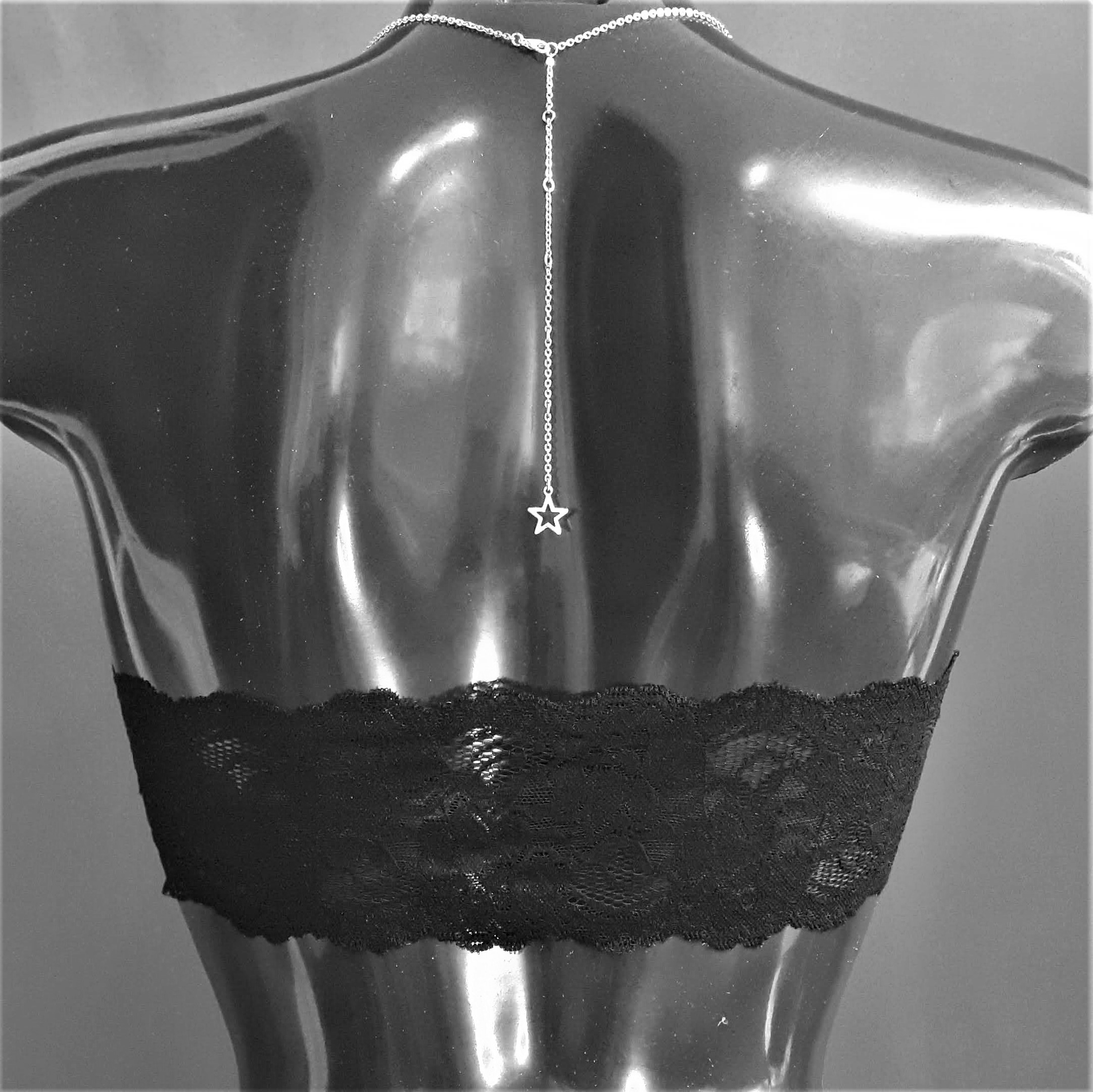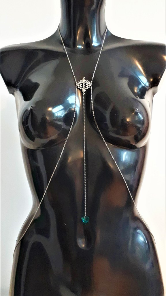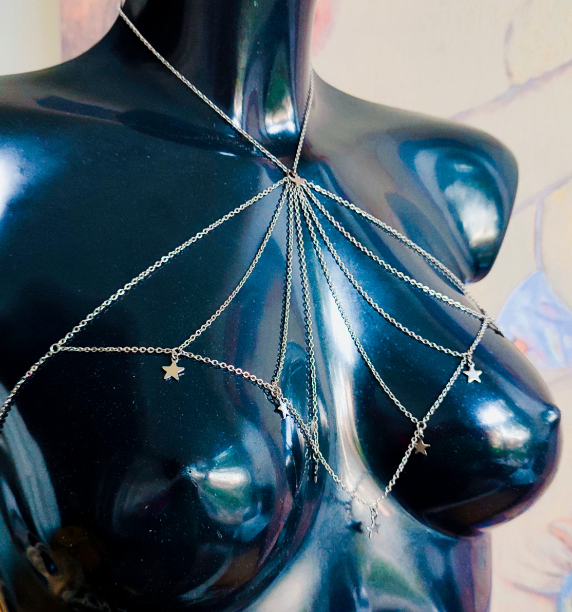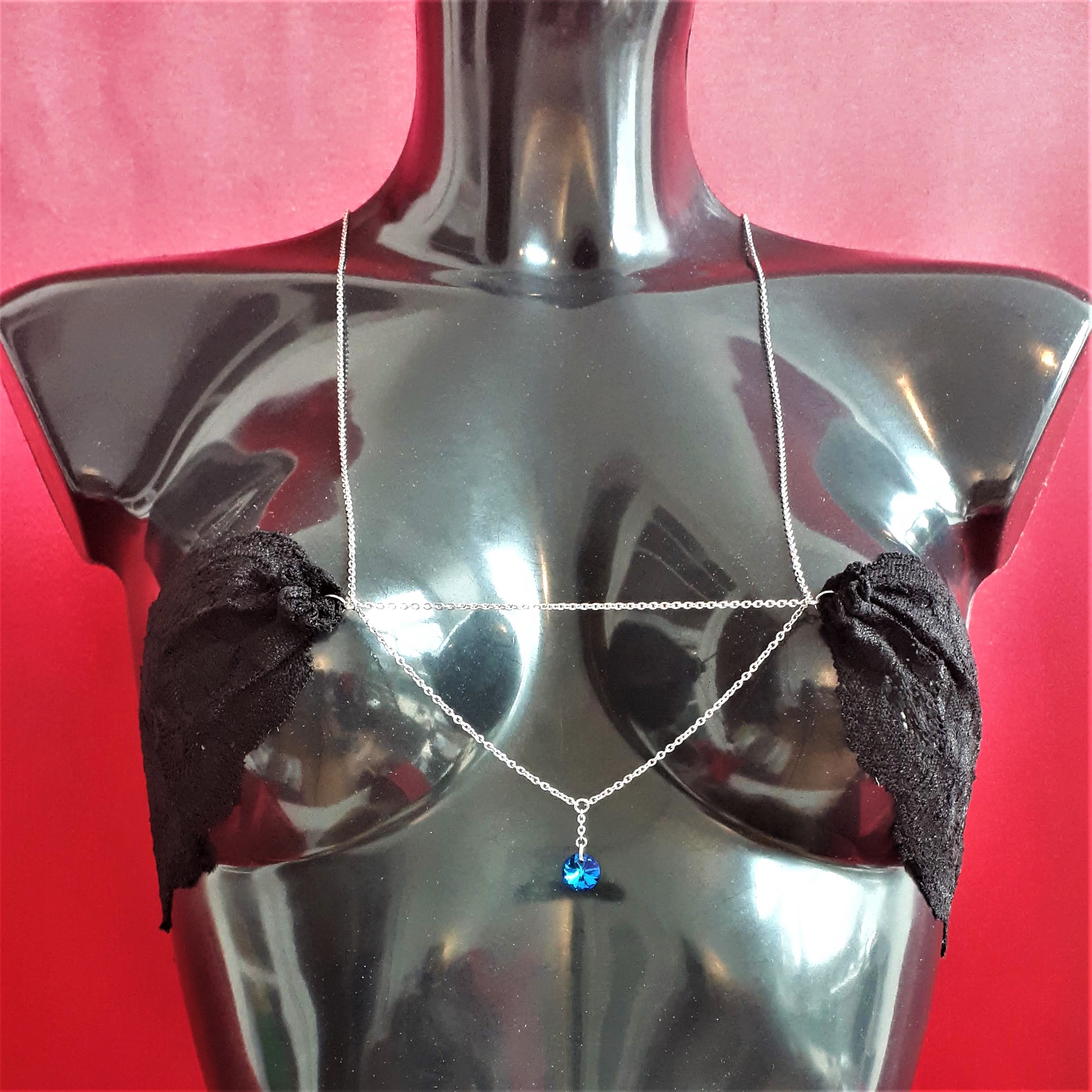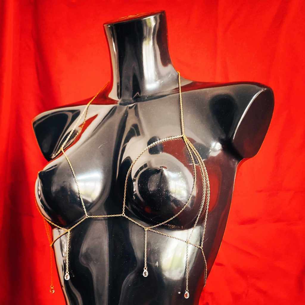 L es colliers de seins et de buste partent du cou pour s’attacher aux seins-mêmes ou les encadrer. Ils sont agrémentés de pièces d’alliage argenté ou doré, de gouttes, de perles ou d’étoiles et ne contiennent ni nickel, ni plomb, ni cadmium. Je propose deux types d’attaches réglables (non douloureuses !) au choix : des attaches en aluminium pour les personnes dont les tétons sont plus larges, ou en silicone pour les tétons plus petits.