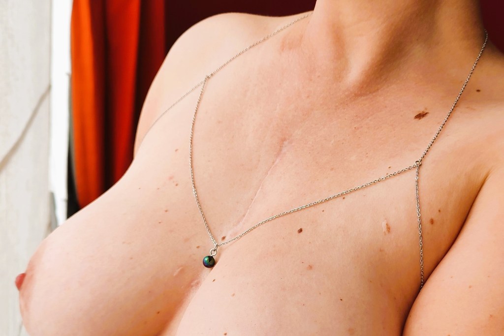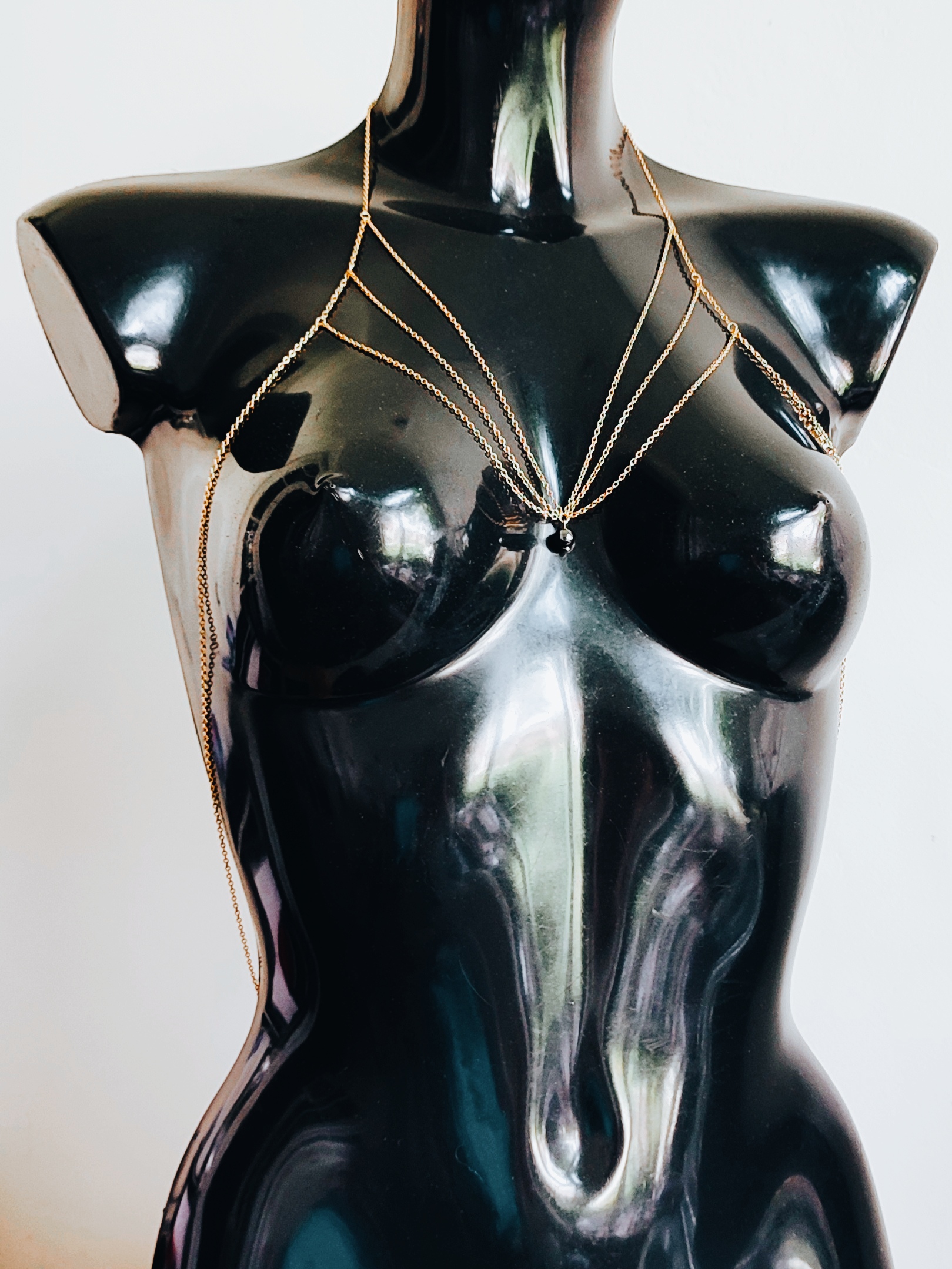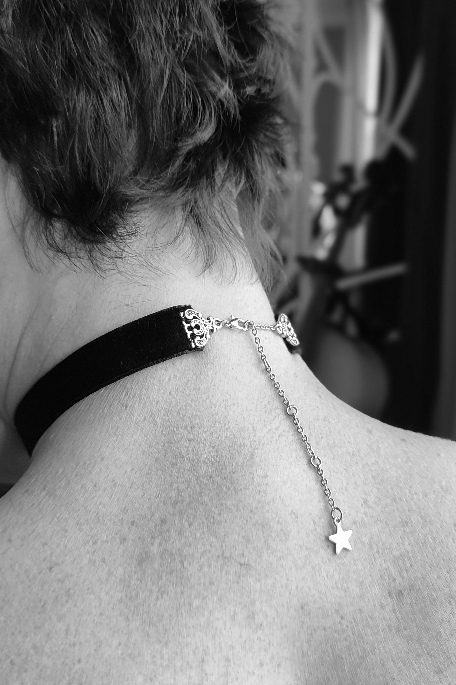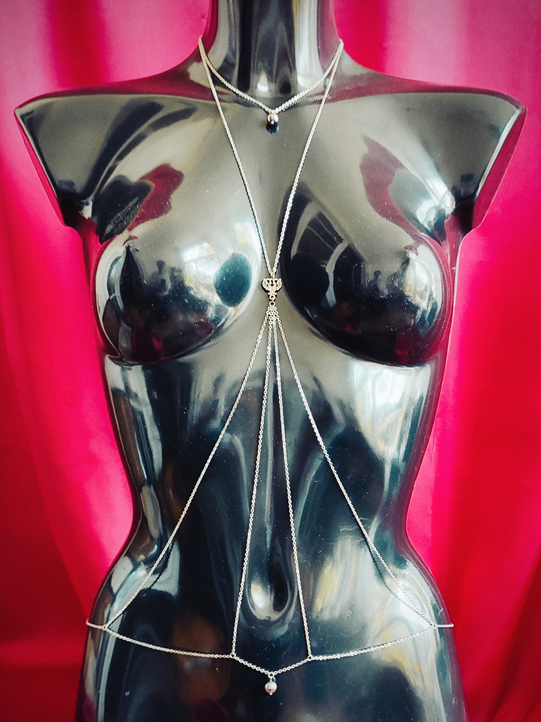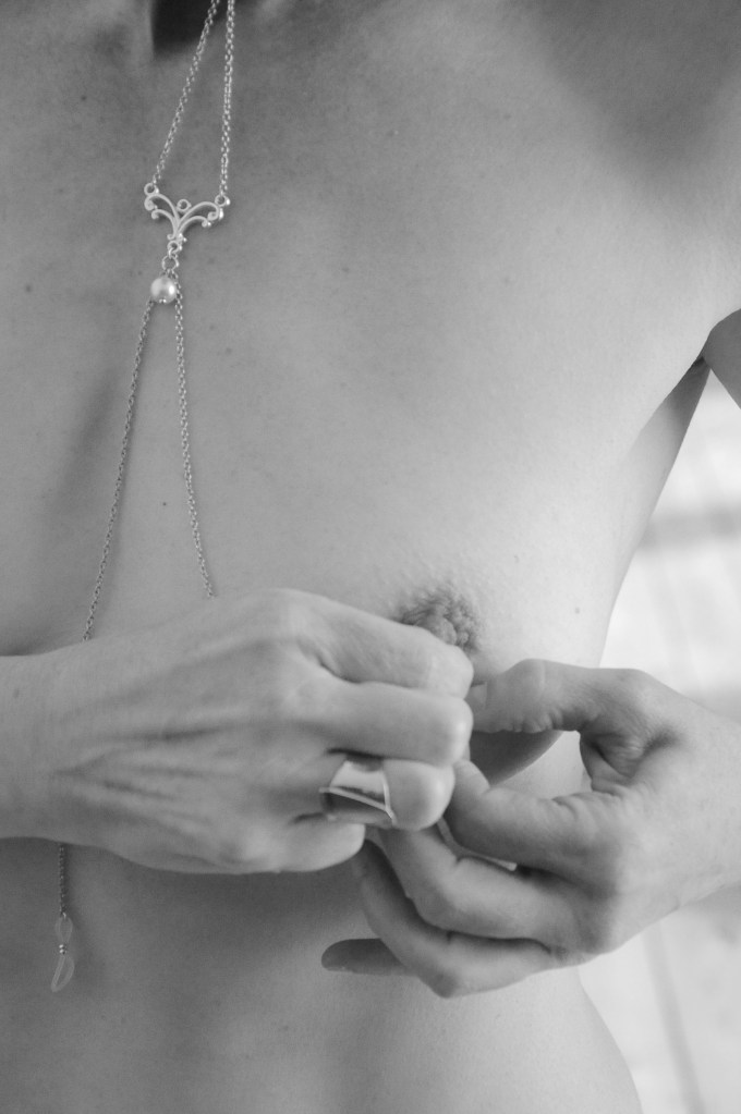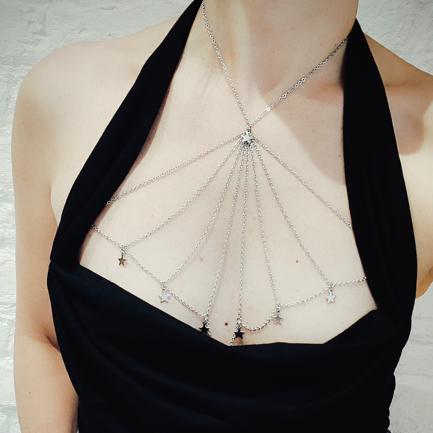 L es colliers de seins et de buste partent du cou pour s’attacher aux seins-mêmes ou les encadrer. Ils sont agrémentés de pièces d’alliage argenté ou doré, de gouttes, de perles ou d’étoiles et ne contiennent ni nickel, ni plomb, ni cadmium. Je propose deux types d’attaches réglables (non douloureuses !) au choix : des attaches en aluminium pour les personnes dont les tétons sont plus larges, ou en silicone pour les tétons plus petits.