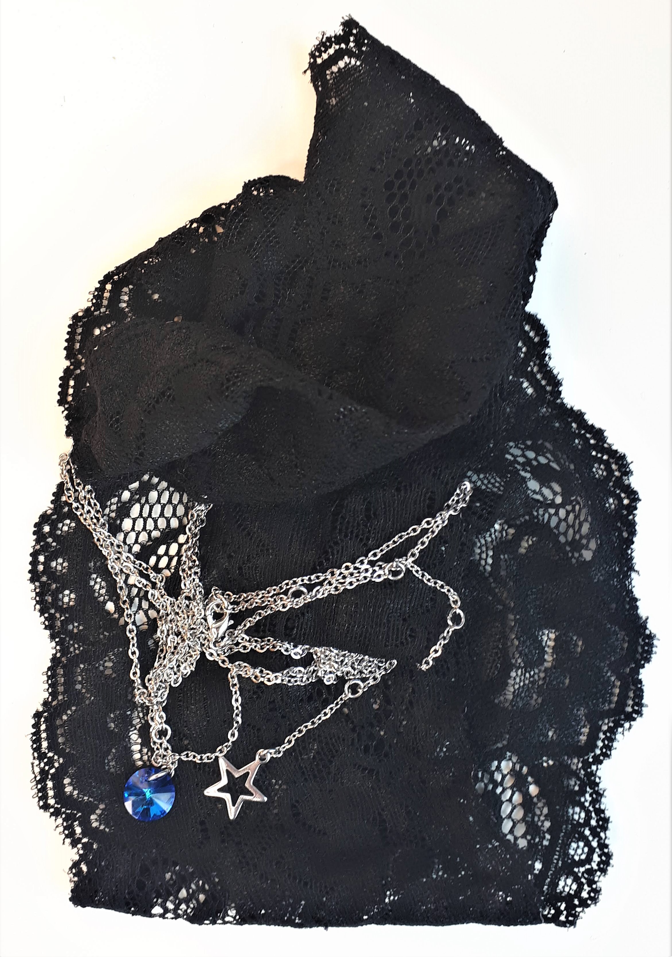 DERNIÈRE PIÈCE ! 79€ 63€ Chaîne en acier inoxydable naturel ou plaqué or et perle en verre bleu roi Dentelle noire élastique