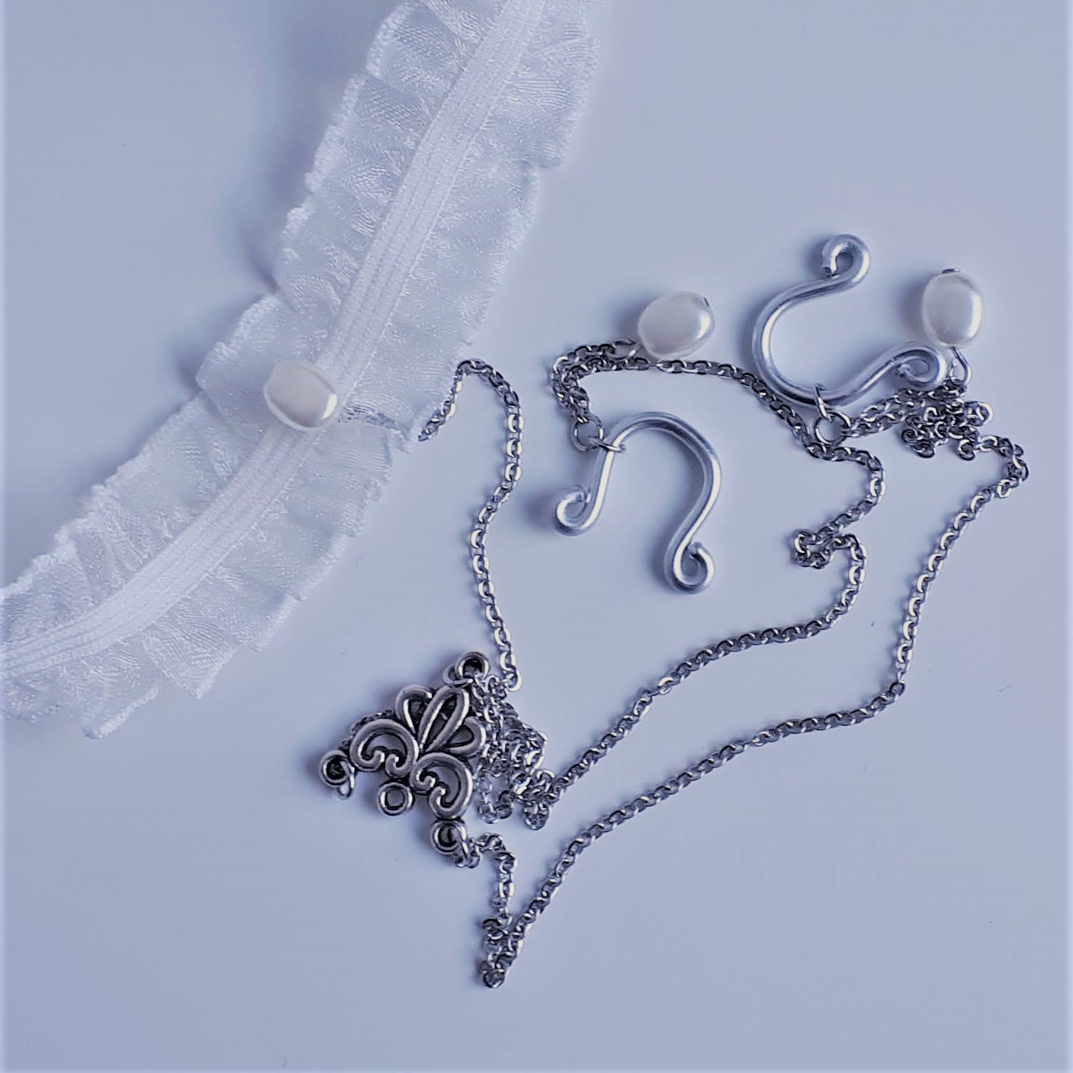 94€ Alliage argenté ou doré et acier inoxydable naturel ou plaqué or, perles blanches Dentelle blanche élastique Attaches en aluminium ou silicone