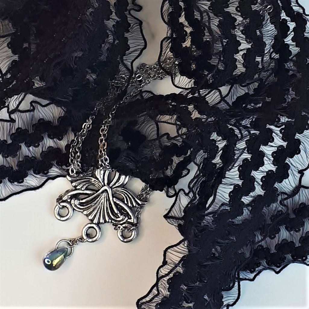 DERNIÈRE PIÈCE ! 89€ 71€ Alliage argenté, chaîne en acier inoxydable et goutte en verre irisé Dentelle élastique noire