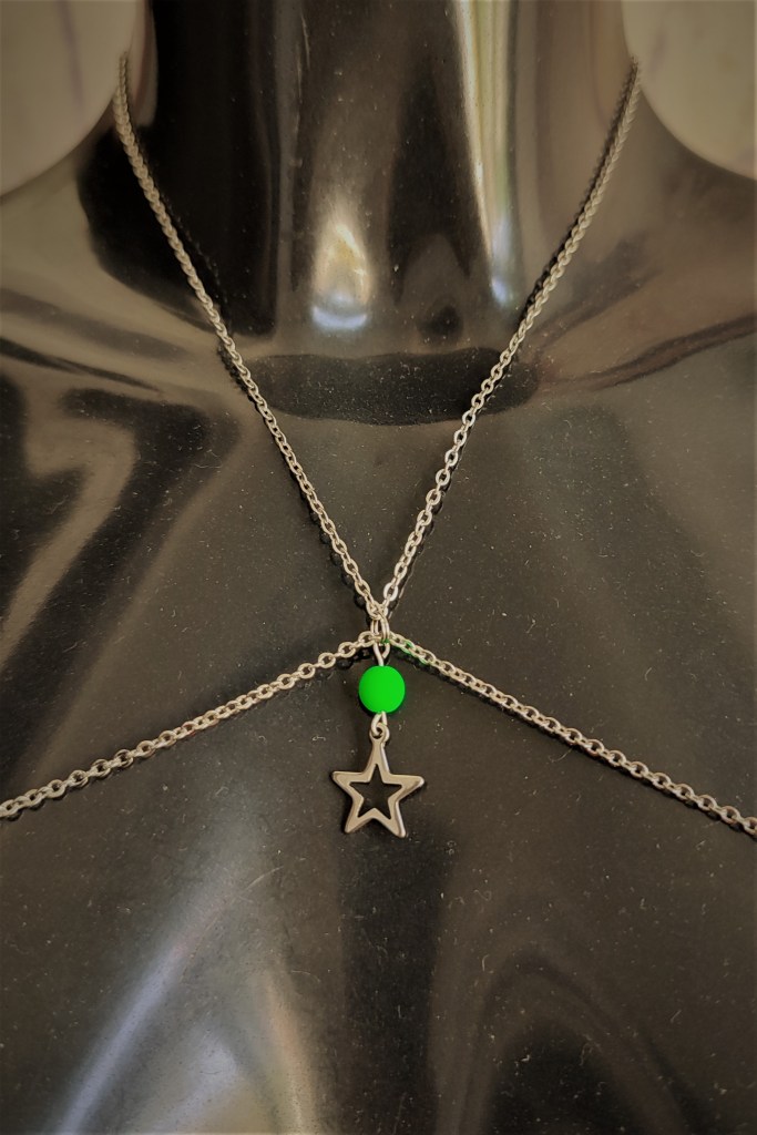 58€ Acier inoxydable naturel et perle en verre vert fluo (autre couleur possible)Réglable